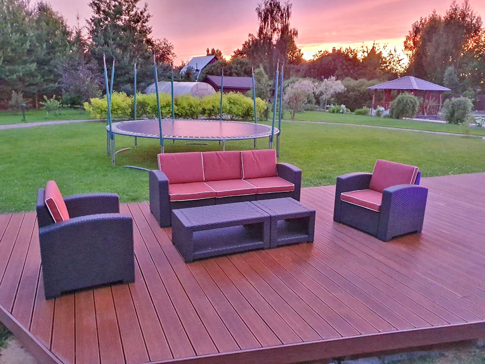 Мебель-мебелью, но нам пришлось еще и подумать о формировании самого пространства для отдыха. И т.к. на территории предполагалось разместить еще и бассейн, то нам потребовалась доска с максимальной устойчивостью к влаге, доска которая не боится высокой влажности и частого контакта с водой. И для этих целей нам подошла доска Holzhof, с отличными свойствами и имитацией настоящего дерева.